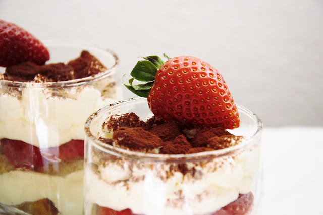 Do skleničky vrstvit piškoty namočené v kávě a ušlehanou hmotu z mascarpone. Proložit vrstvou ovoce nebo jen ozdobit. Vrchní vrstvu jemně posypat kakaem.
